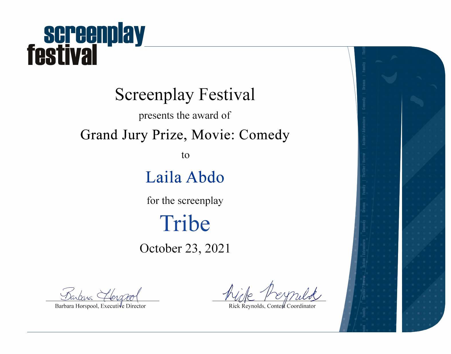 - October 23, 2021 – Drum roll, please! Tribe is selected as the Grand Prize Winner in Comedy! I am so honored! Tribe is Number One! Looking forward to more opportunities!
